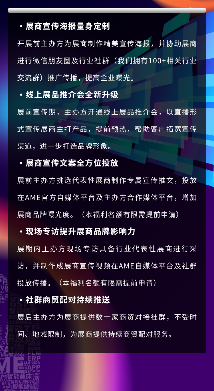 · 100+媒體全方位營銷:聯(lián)合百家頭部媒體、各官方自媒體平臺進(jìn)行全方位營銷,為服裝智能制造企業(yè)進(jìn)行全方位宣傳推廣!
