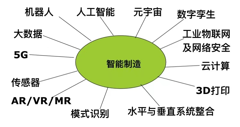 由圖可知,要實(shí)現(xiàn)制造業(yè)的智能制造,必須要有人工智能技術(shù)、大數(shù)據(jù)技術(shù)、機(jī)器人技術(shù)、元宇宙、5G、數(shù)字孿生、工業(yè)互聯(lián)網(wǎng)及平臺(tái)技術(shù)、云計(jì)算技術(shù)、傳感器技術(shù)、AR/VR/MR技術(shù)、增材制造技術(shù)、縱模向系統(tǒng)集成技術(shù)等等的實(shí)現(xiàn)。