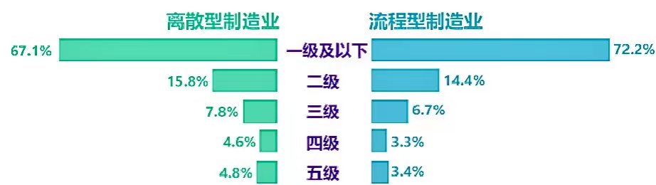 據(jù)賽西數(shù)智化轉(zhuǎn)型調(diào)查,2021年我國(guó)智能制造離散型和流程型企業(yè)達(dá)到的智能制造成熟度級(jí)別水平占比如下,見(jiàn)圖四。