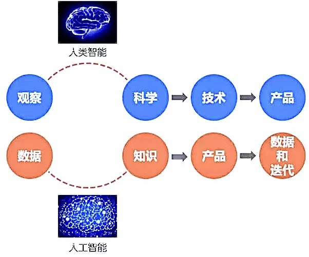 例如,同樣要制造一個(gè)產(chǎn)品,人靠觀察思考以及科學(xué)技術(shù)獲得產(chǎn)品,而機(jī)器靠獲取數(shù)據(jù)里的知識(shí)和利用數(shù)據(jù)不斷迭代而獲得產(chǎn)品,可見(jiàn)數(shù)據(jù)和知識(shí)是一體兩面,數(shù)據(jù)是知識(shí)的載體,見(jiàn)圖八。