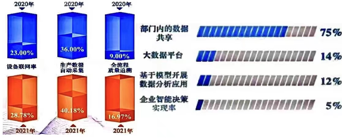 2021年我國(guó)制造業(yè)大數(shù)據(jù)采集與應(yīng)用情況并不見(jiàn)好,企業(yè)自動(dòng)數(shù)據(jù)采集只達(dá)到40.18%,企業(yè)內(nèi)部各部門間共享數(shù)據(jù)只達(dá)到75%,能應(yīng)用大數(shù)據(jù)平臺(tái)的只有14%,對(duì)基于模型開展大數(shù)據(jù)應(yīng)用分析的只有12%,能夠利用大數(shù)據(jù)進(jìn)行智能決策的只有5%,見(jiàn)圖九。