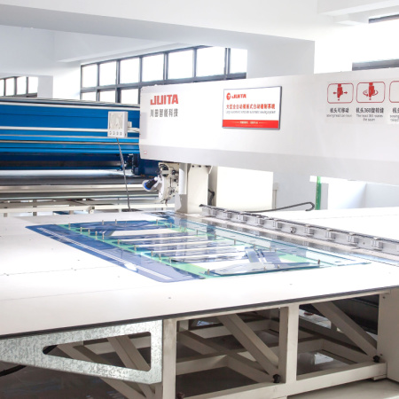 具有縫紉范圍大:200公分x130公分,可搭載激光切割裝置,機頭具備機頭升降功能,線跡360度旋轉(zhuǎn)縫紉功能。