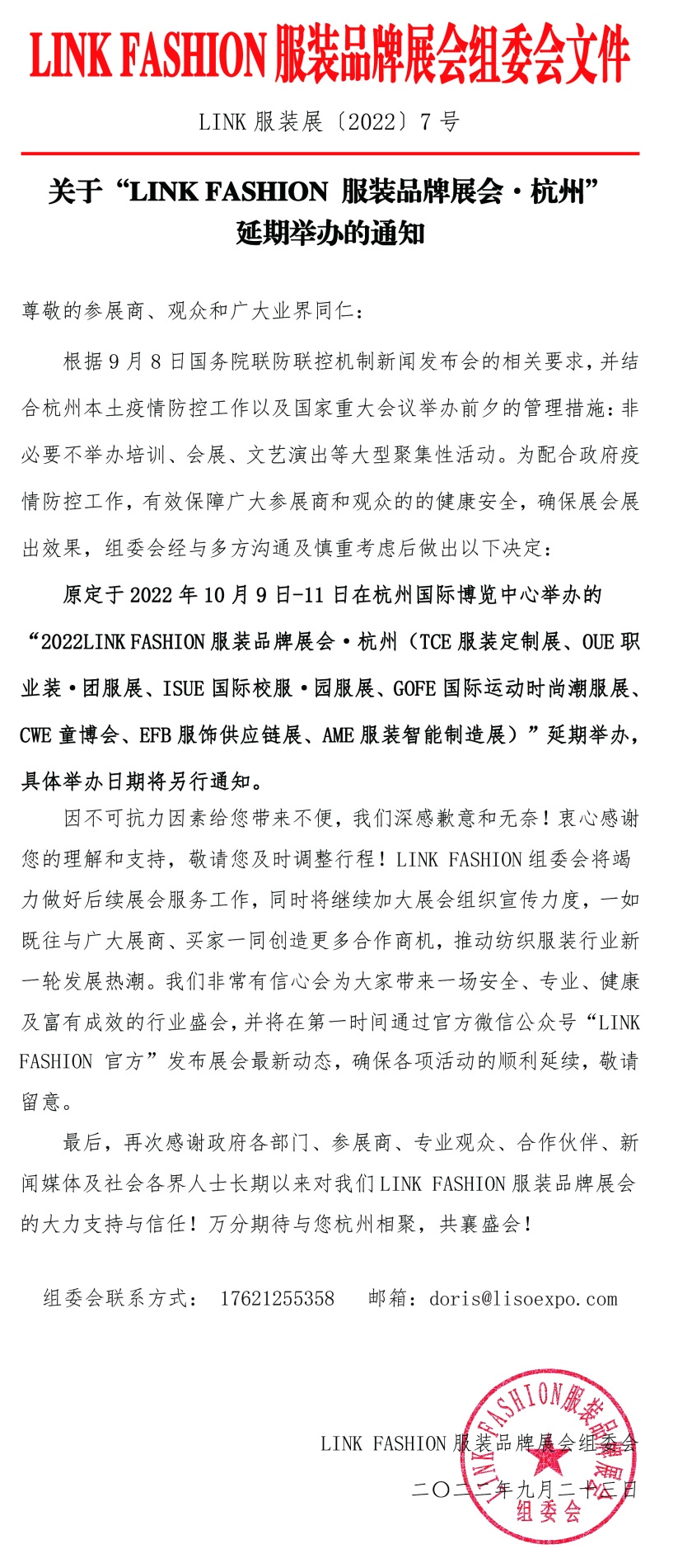 AME組委會經(jīng)多方研究協(xié)調(diào)后決定:原定2022年10.9-11日在浙江杭州國際博覽中心舉辦的“2022AME服裝智能制造展”將延期舉辦,具體時(shí)間另行通知,舉辦地點(diǎn)不變。