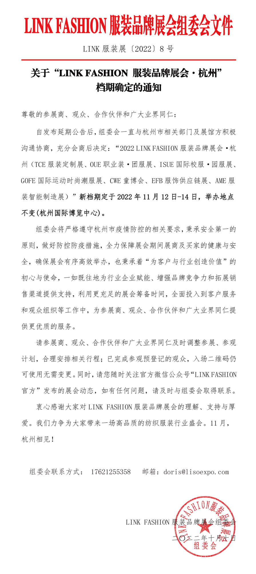 “2022AME服裝智能制造展”最新定檔于2022年11.12-14日,舉辦地點(diǎn)不變(杭州國際博覽中心)。